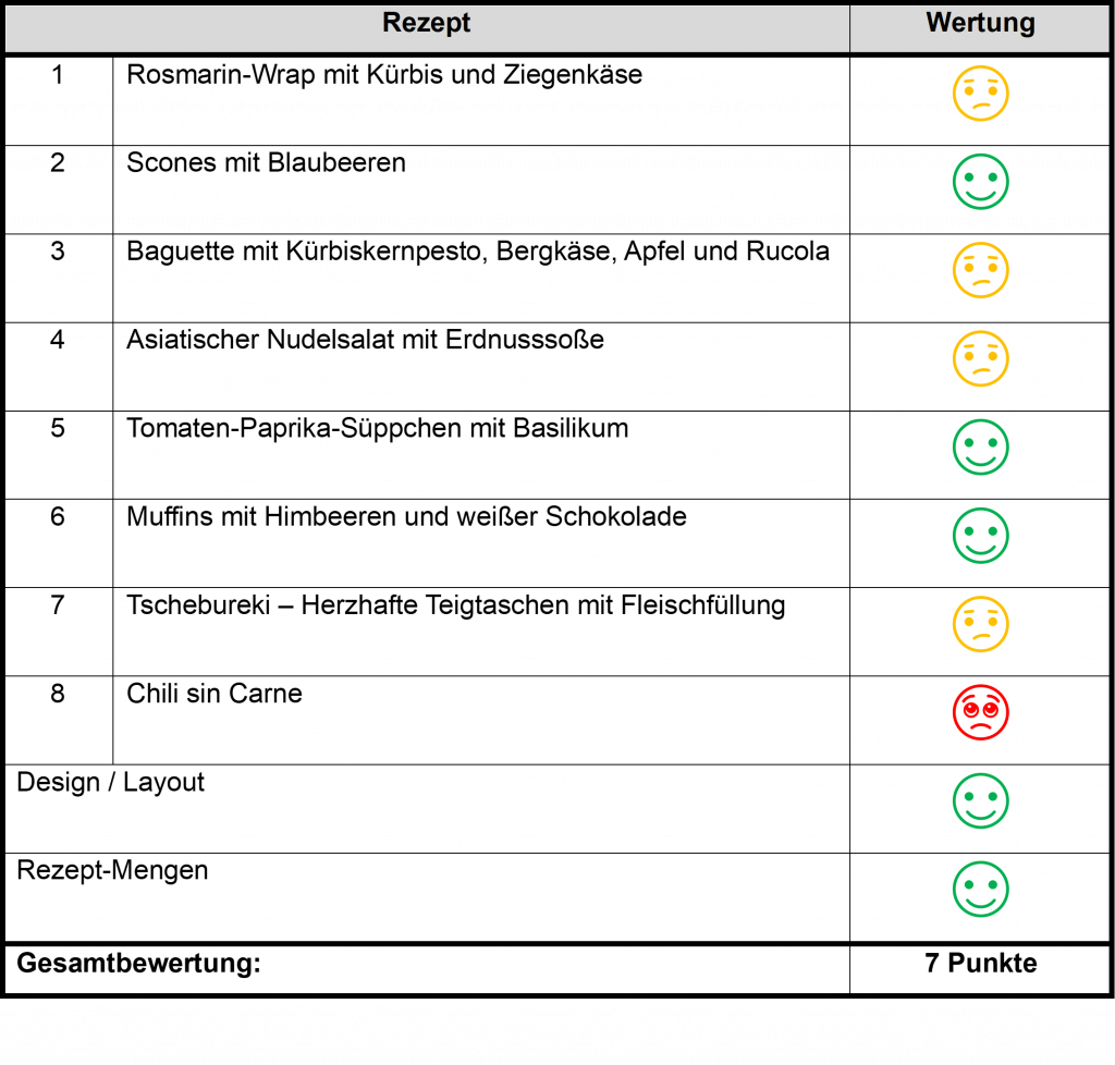 Zusammenfassend möchte sagen, dass „Genuss im Rucksack“ ein schönes Kochbuch für den nächsten Outdoor-Ausflug mit vielen nützlichen Praxis-Tipps ist. Hier und da würde ich die Zusammensetzung der Gerichte bzw. die Würzung etwas anpassen, aber es sind sehr schöne Ideen mit dabei. Von mir gibt es gute 7 von 10 Punkten.