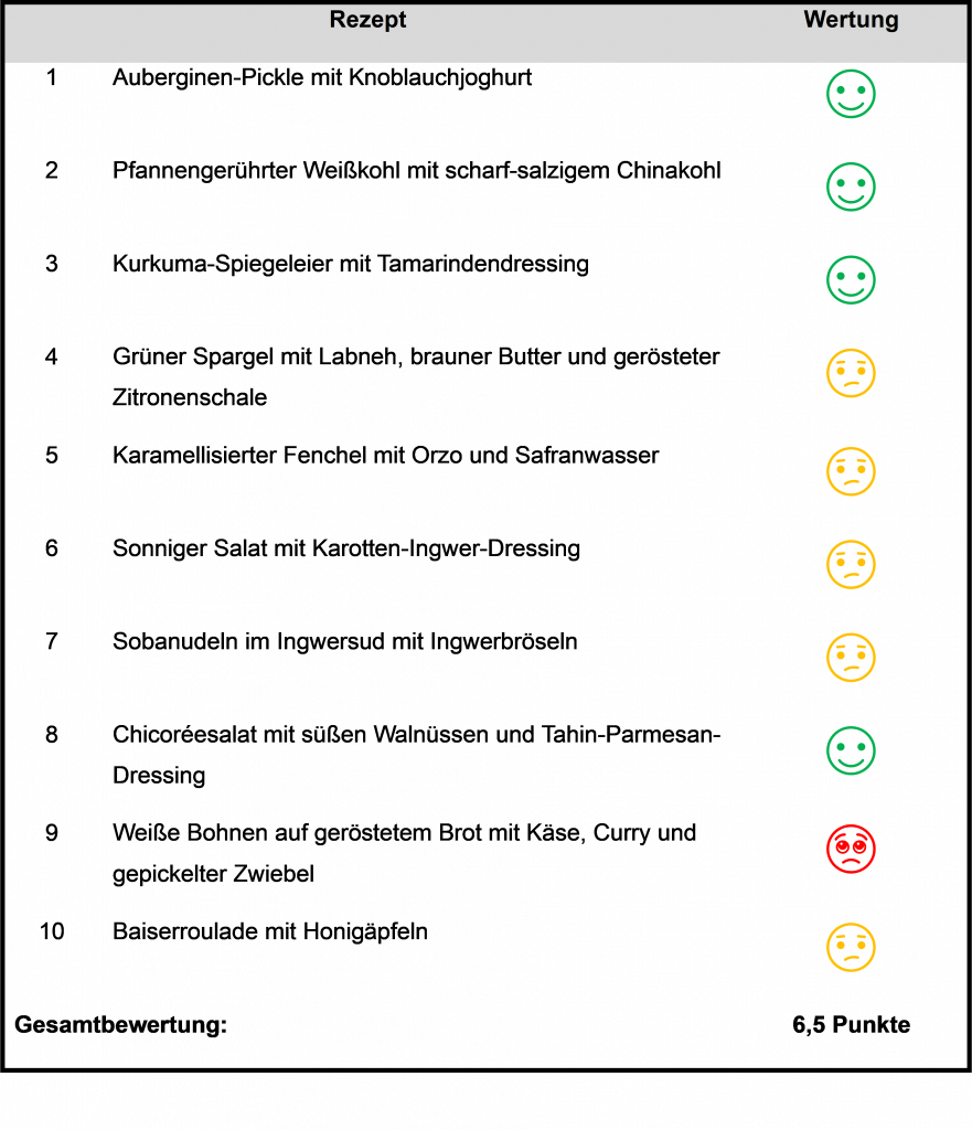 Weiter geht’s mit den Bewertungen. Sehr gut gefallen haben mir z. B. die „Kurkuma-Spiegeleier mit Tamarindendressing“ (Interessante Aromen und relativ viel Säure, aber es passt irgendwie) und der „Chicoréesalat mit süßen Walnüssen und Tahin-Parmesan-Dressing“ (sehr würzig und cremig, die süß-scharfen Nüsse sind ein guter Kontrast dazu).